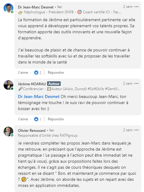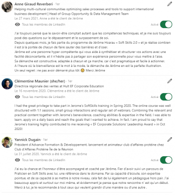 "La formation de Jérôme Praticien Soft Skills à été un réel boost dans ma carrière lors de cette première année en tant que directrice régionale de ventes. J'ai appris à mieux me connaître, mieux interagir, récolter des conseils très concrets à appliquer, bénéficier d'un soutien coaching par Jérôme lui même et ce fut une opportunité en or de networker avec des francophones de toute part, qui m'ont aussi appris en partageant leur expérience. Le format de la formation était bien adapté avec des séances en groupe, en trio et du travail à faire en solo pour avancer vers l'objectif fixé en début de programme. Je recommande cette formation les yeux fermés, c'était non seulement enrichissant, inspirant et surtout très pratico pratique ce qui n'est pas toujours le cas avec les soft skills ! Bravo Jérôme et son équipe pour la mise en place et le déroulement.