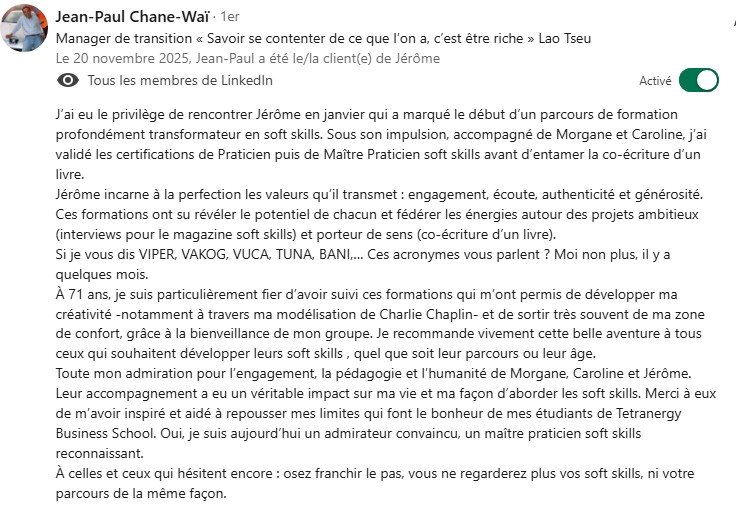 - Une recommandation personnalisée de vos soft skills (que je rédigerai personnellement)